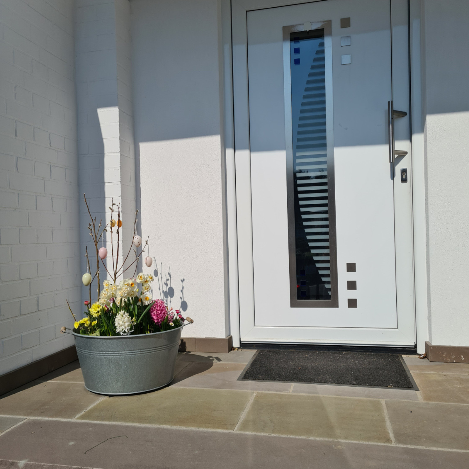 Hier bewohnen wir mit unseren 9 Zwergen den unteren Teil des Hauses an dem ein kleines, aber feines Außengelände gelegen ist. Über eine prunkvolle Steintreppe erreichen Sie den Eingang.