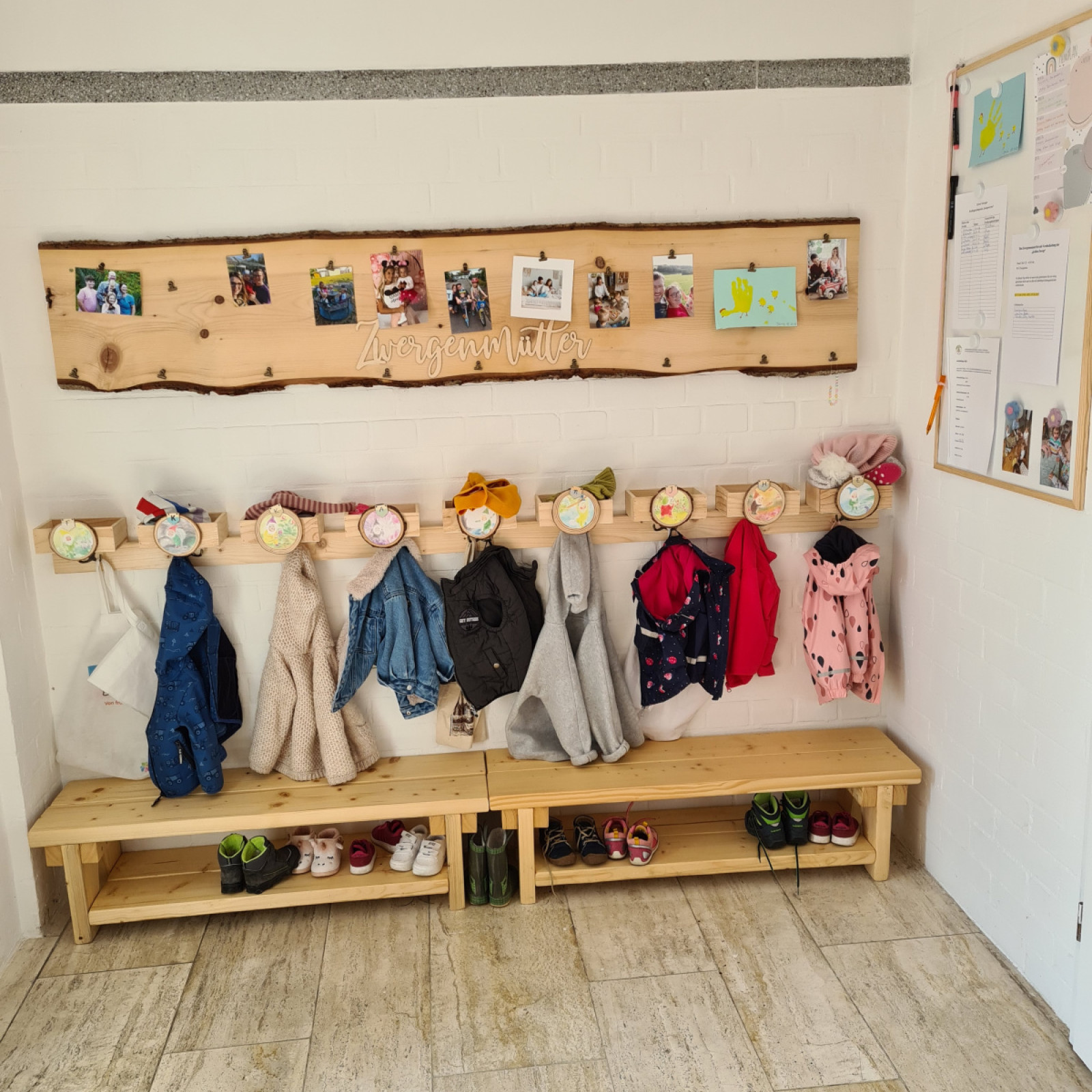 Unser geräumiger Garderobenbereich grenzt an unseren hellen, einladenden Gruppenraum. Hier wird gespielt, gesungen und gelacht. Zudem verfügen wir über einen großzügigen Ruheraum, in dem jedes Kind sein eigenes liebevoll hergerichtetes Zwergenbettchen hat. Auch steht unseren Kindern ein Nebenraum zur Verfügung. Hier können sich beispielsweise die "großen " Zwerge auch mal zurück ziehen und ganz ungestört etwas bauen etc.